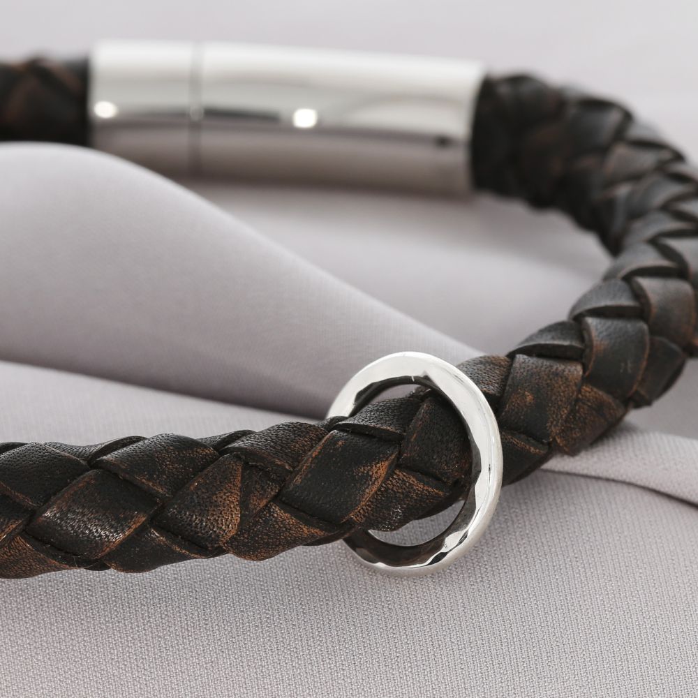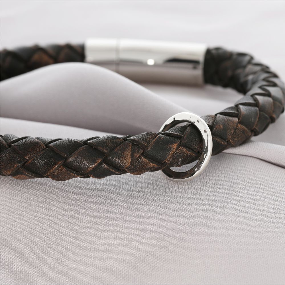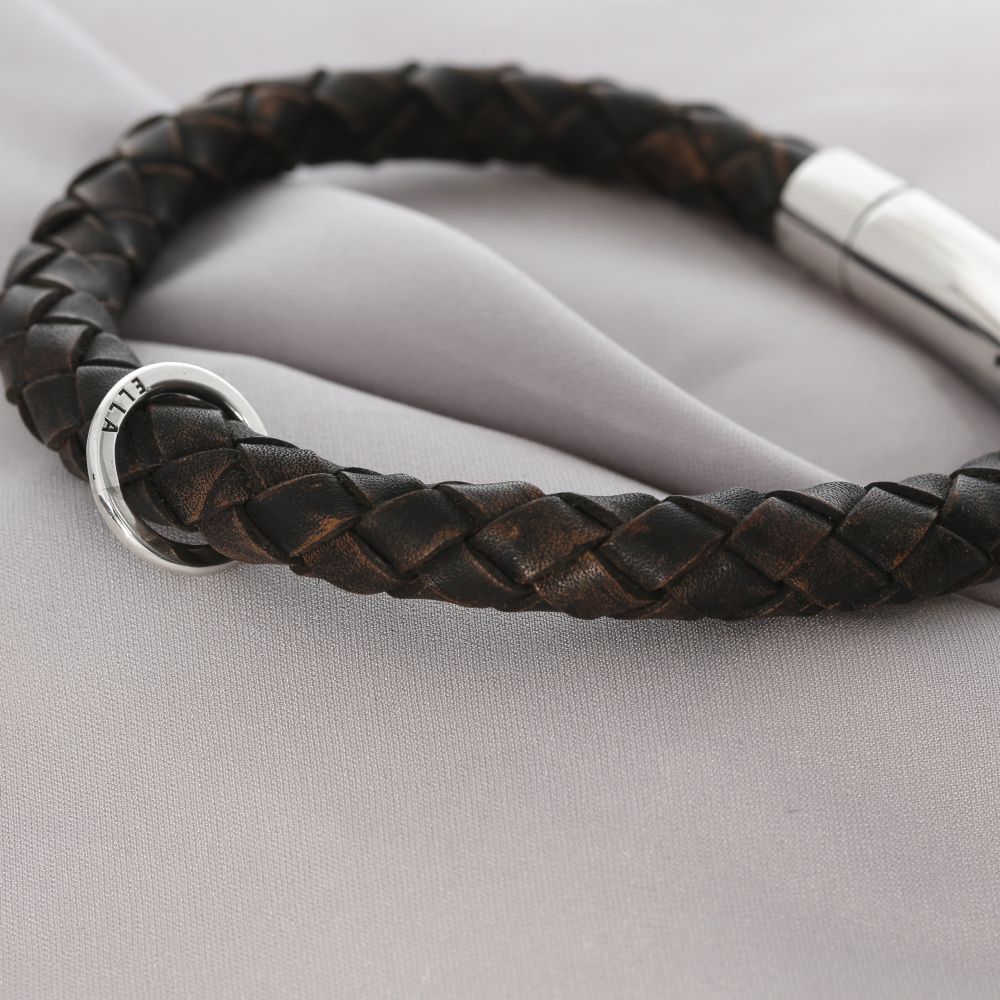 Der Bajonettverschluss ist aus Edelstahl. Das Armband wird aus geflochtenem Leder hergestellt. Das Lederband ist ca. 8mm stark und in schwarz oder antikbraun (wie auf den Fotos) verfügbar.