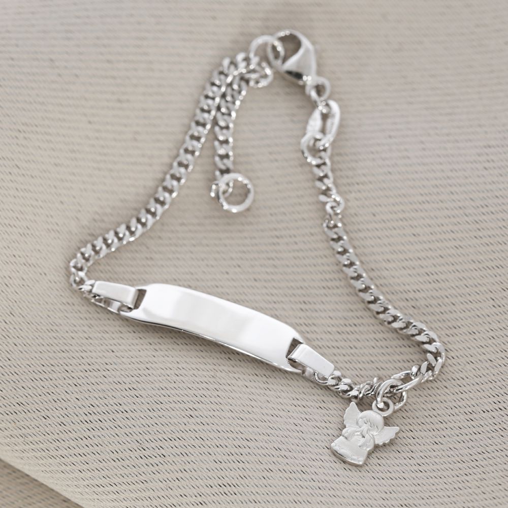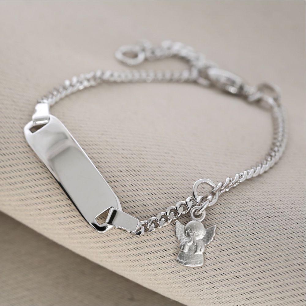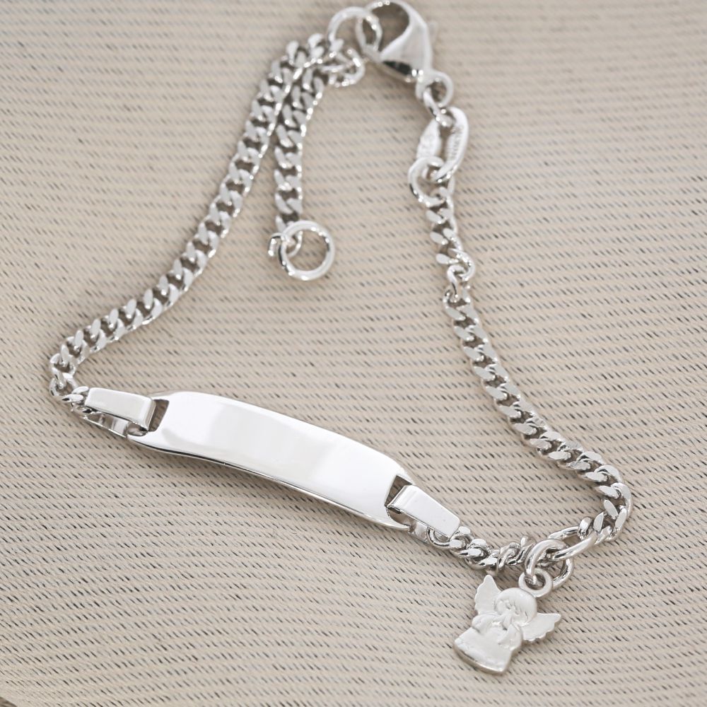 Ein tolles ID Armband aus 925 Silber mit einem Engel Anhänger und einer Gravurplatte. Die Gravurplatte kann vorne uns hinten graviert werden.