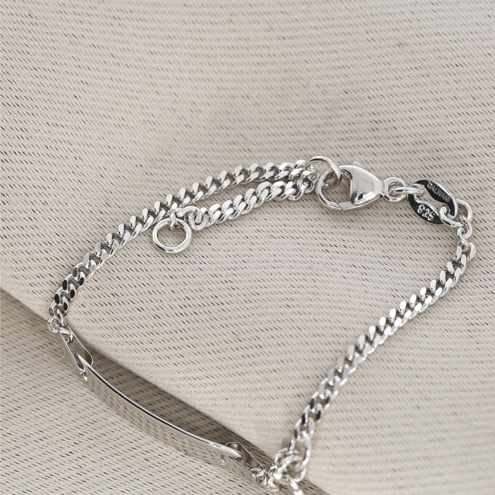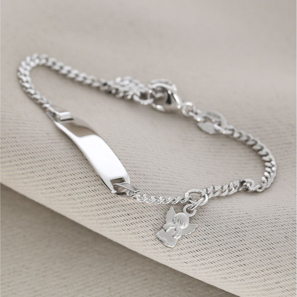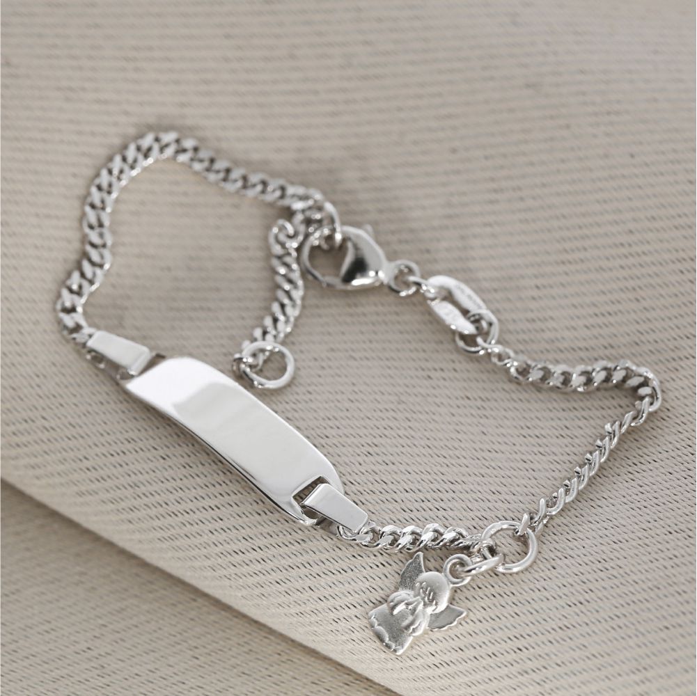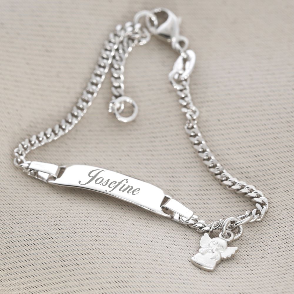Ein tolles ID Armband aus 925 Silber mit einem Engel Anhänger und einer Gravurplatte. Die Gravurplatte kann vorne uns hinten graviert werden.