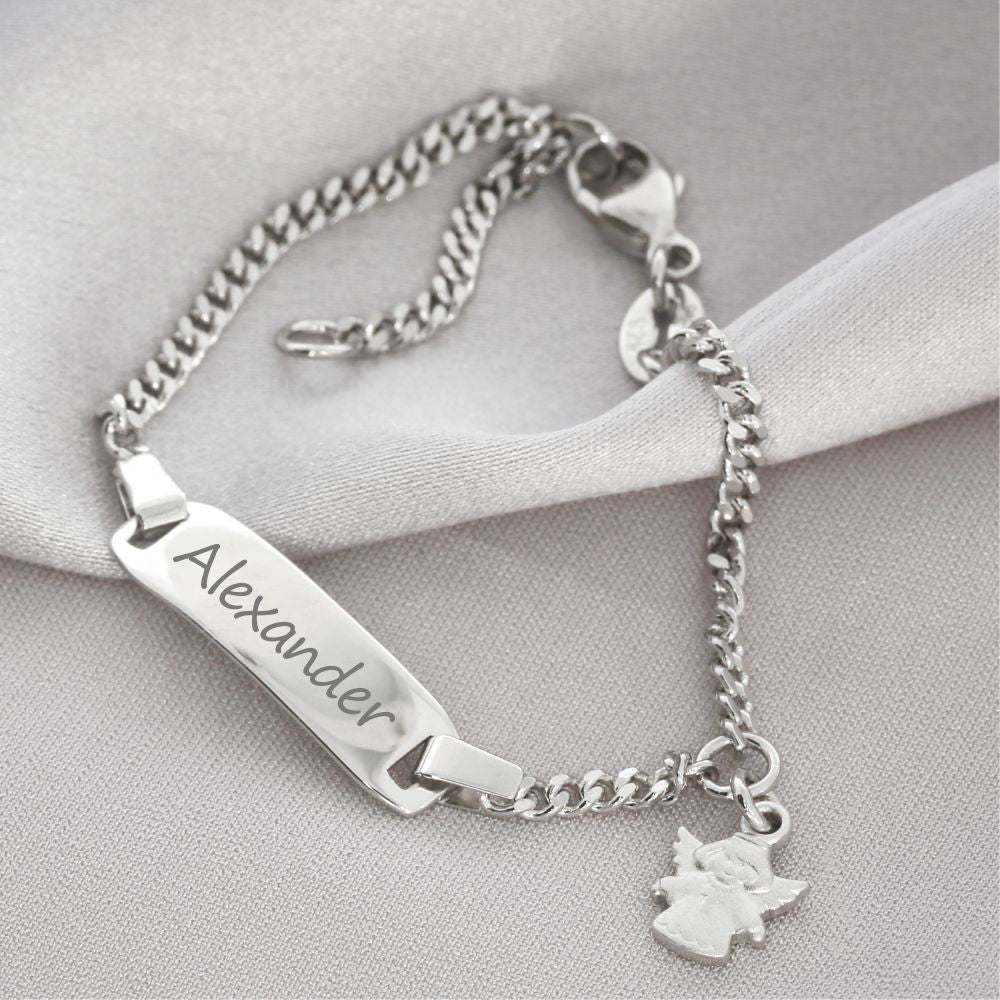 Unsere Armbänder für Kinder und Babys sind aus 925 Silber und alle Ösen werden gelötet, damit das Armband nicht aufgehen kann. Dennoch sollten Sie Babys und Kleinkinder nicht unbeaufsichtigt damit spielen lassen. Ausserdem sollten Sie darauf achten, dass das Kind mit dem Armband nicht am Boden krabbelt oder auf einem anderen Weg mit der Gravurplatte an harte Gegenstände kommt. Dies kann die polierte Platte mit Namen sehr schnell zerkratzen und gegebenfalls die Gravur beschädigen.