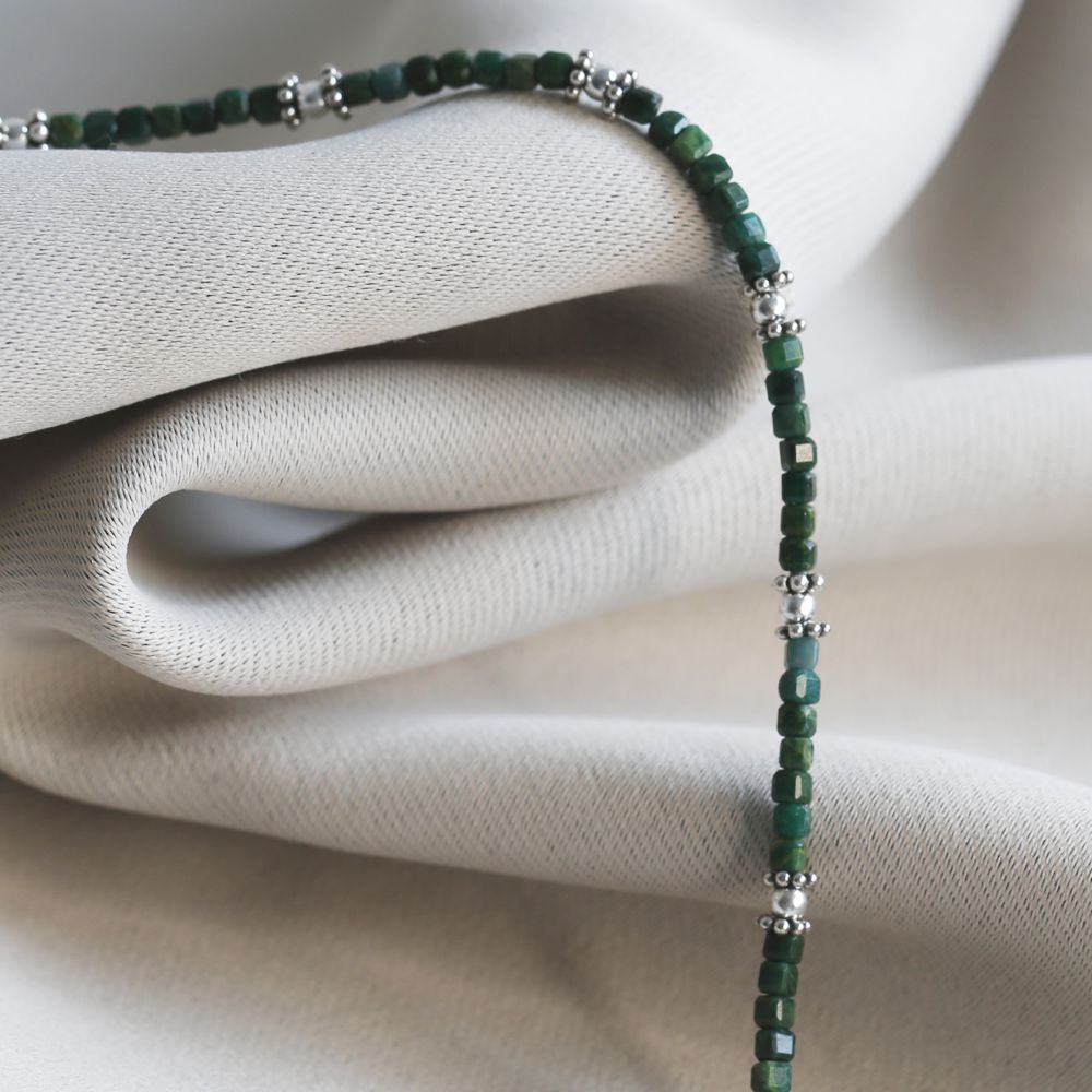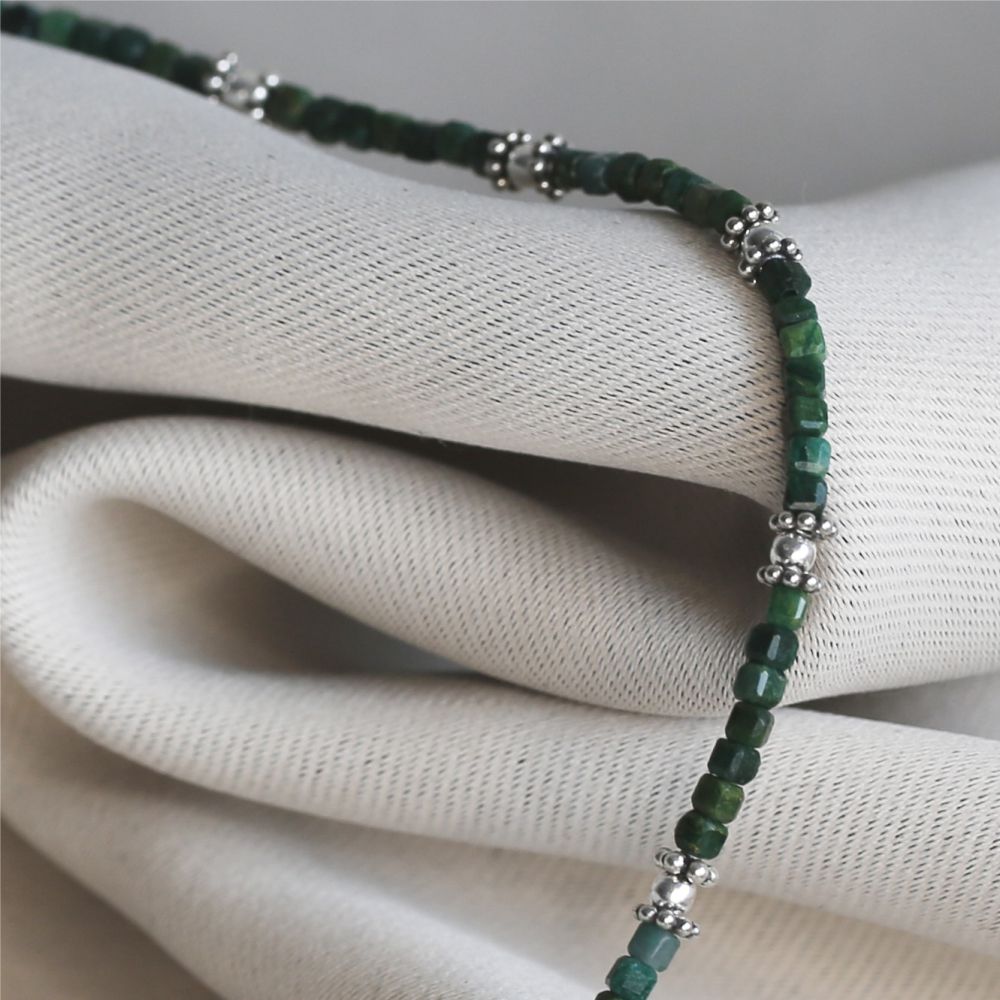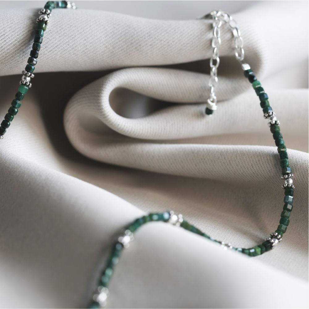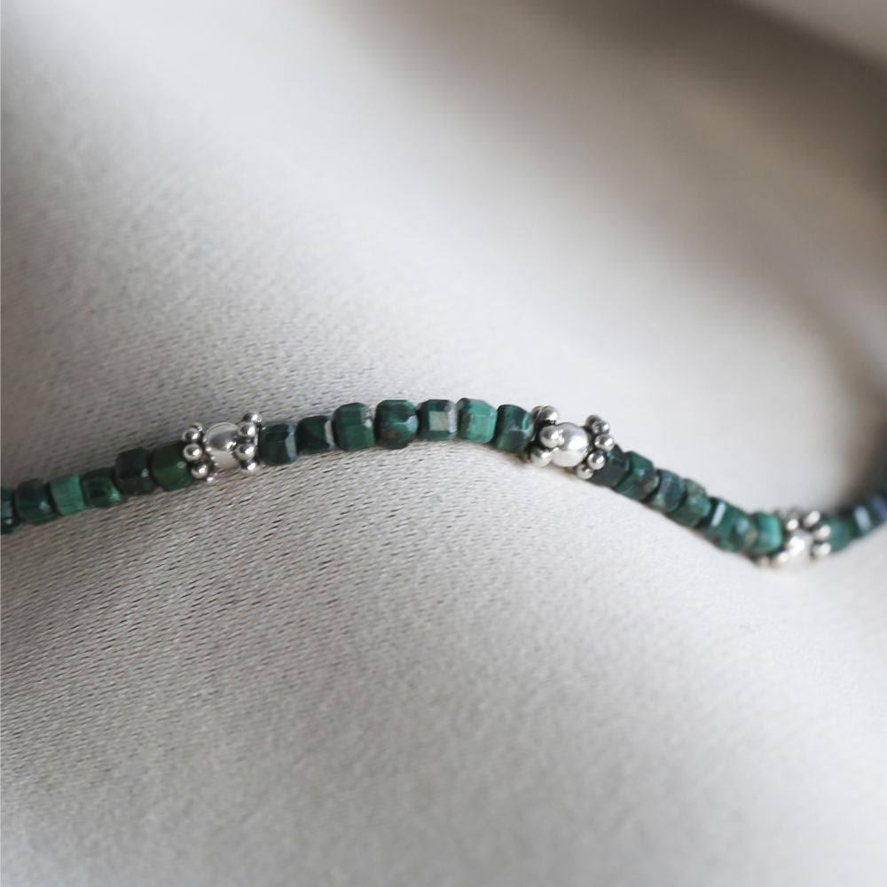 Diese Kette  ist ca. 2,5mm stark und besteht im größten Teil aus quadratischen Perlen aus Malachit. Malachit soll gegen böse Geister beschützen und symbolisiert Wandel, Kreativität und persönliches Wachstum.