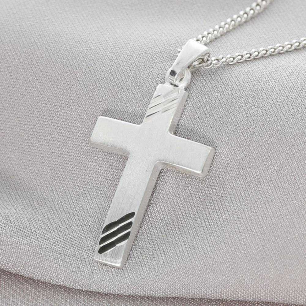 Ein mattes Kreuz, oben und unten eingefräste glänzende Linien. Der Anhänger ist aus 925 Silber, massiv, kann vergoldet oder rosé vergoldet werden. Das Kreuz ist ca. 21x14mm groß.