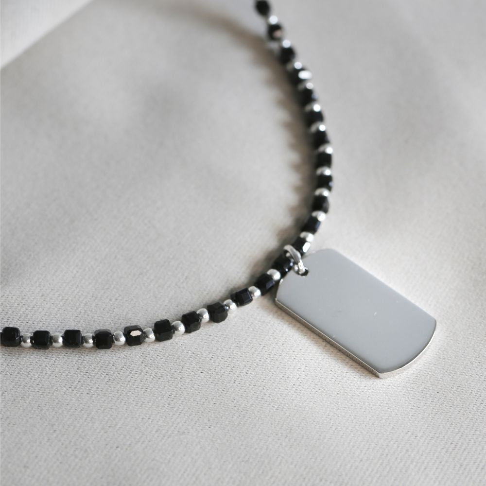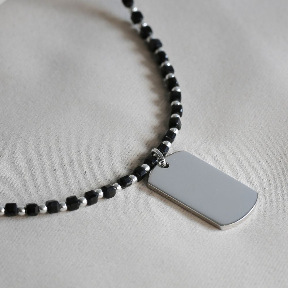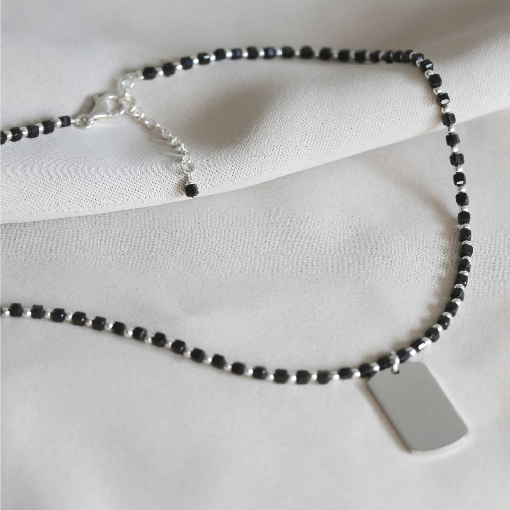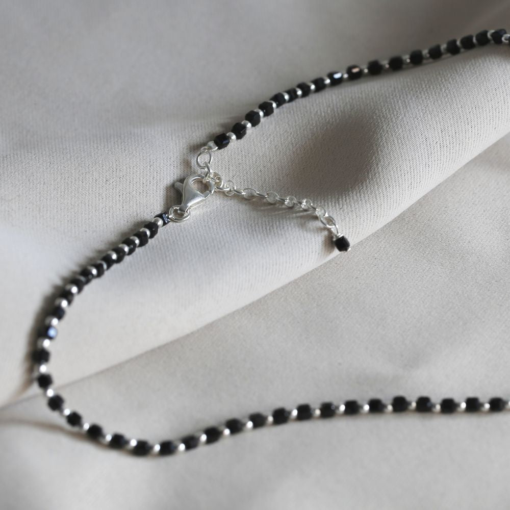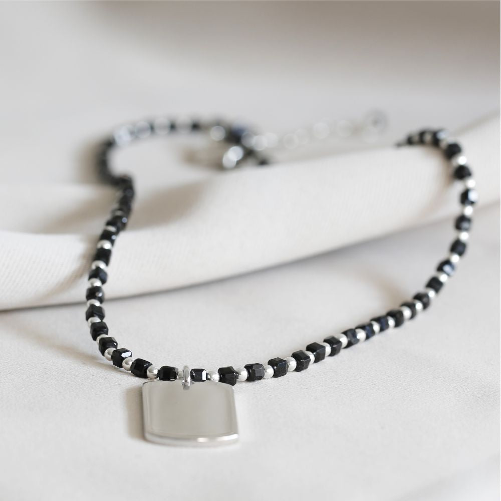 Halskette für Herren mit kleinen Naturstein Perlen aus schwarzem Quarz und 925 Silber