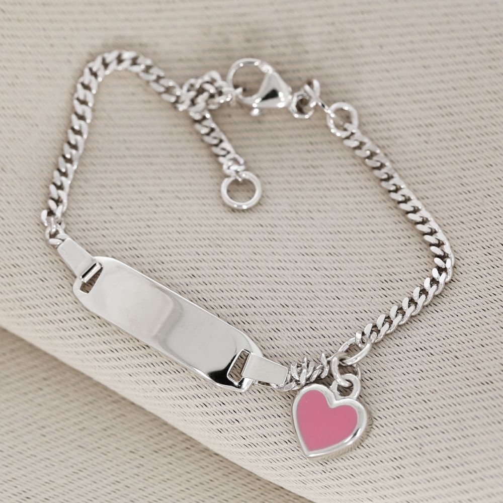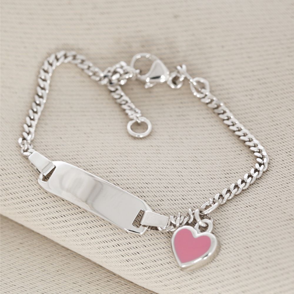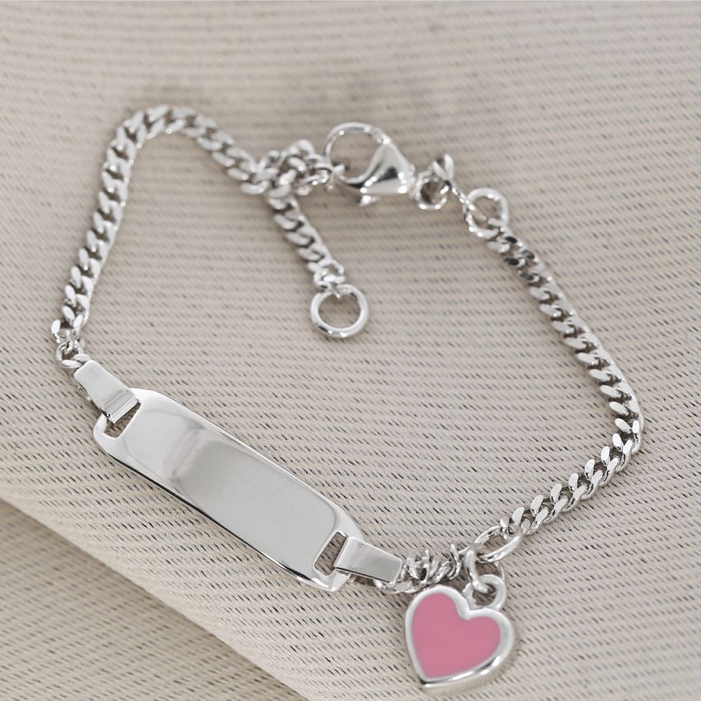 Ein tolles ID Armband aus 925 Silber mit einem massiven emaillierten Herz Anhänger und einer Gravurplatte. Die Gravurplatte kann vorne uns hinten graviert werden.