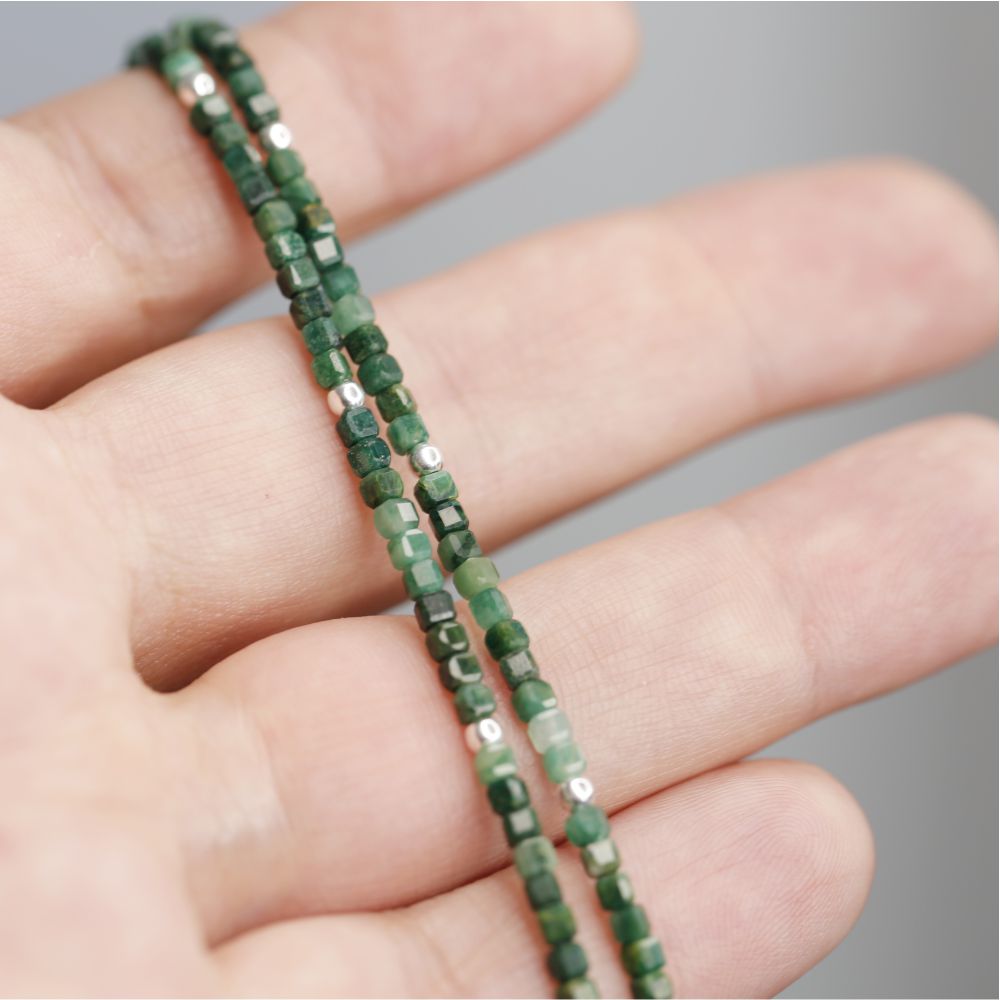 Diese Kette ist ca. 2,5mm stark und besteht im größten Teil aus quadratischen Perlen aus Jade.