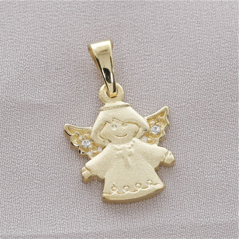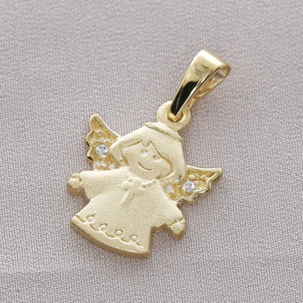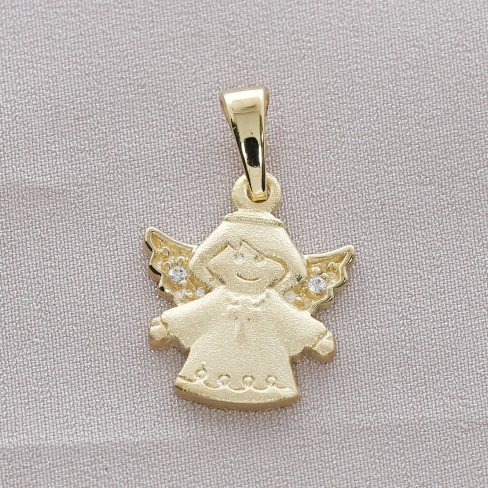 Ein schöner, kindlicher Engel Anhänger mit kleinen Kristallen in den Flügeln. Der Anhänger ist aus 925 Silber und ist vergoldet. Der Anhänger ist ca. 12x12mm groß.