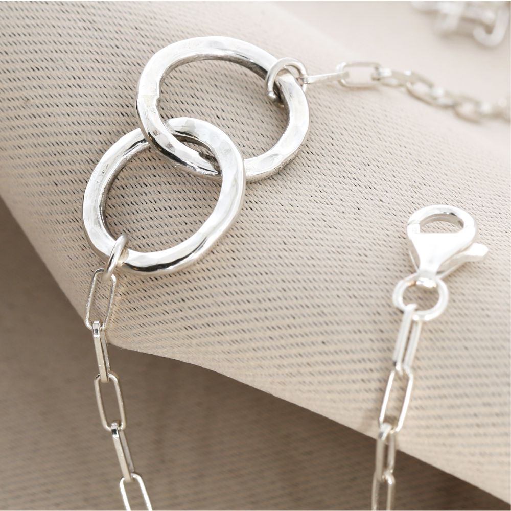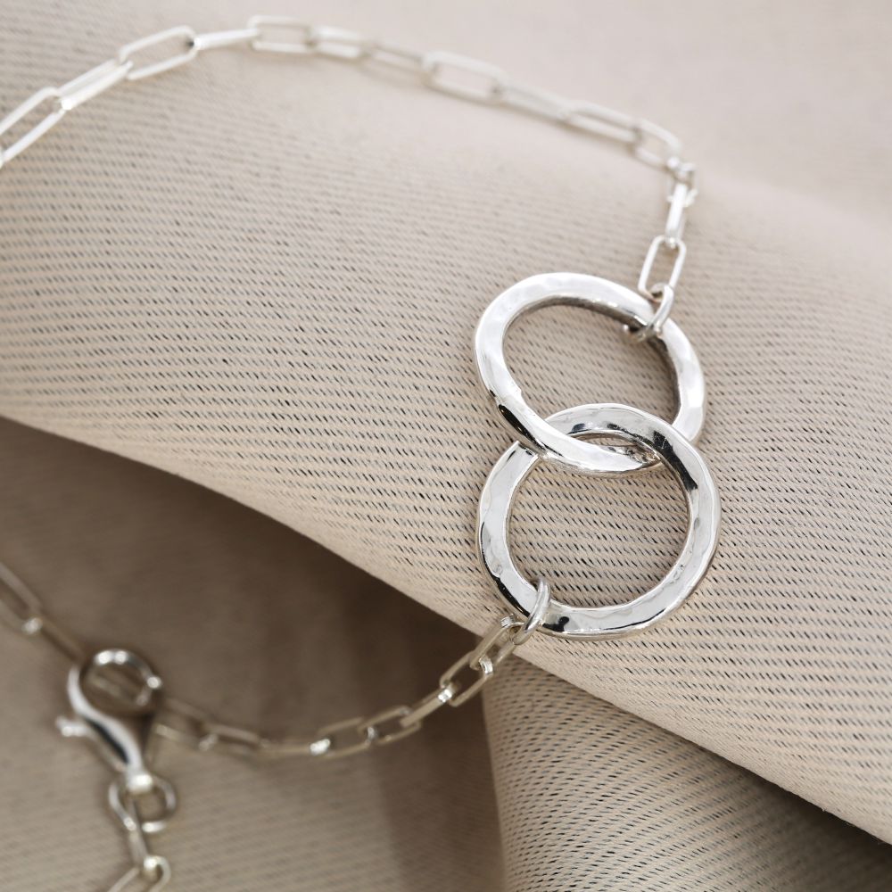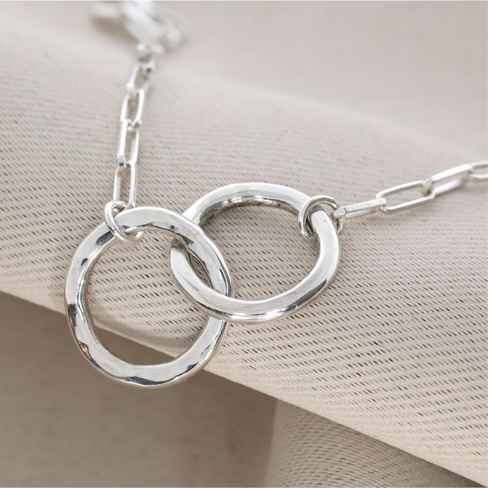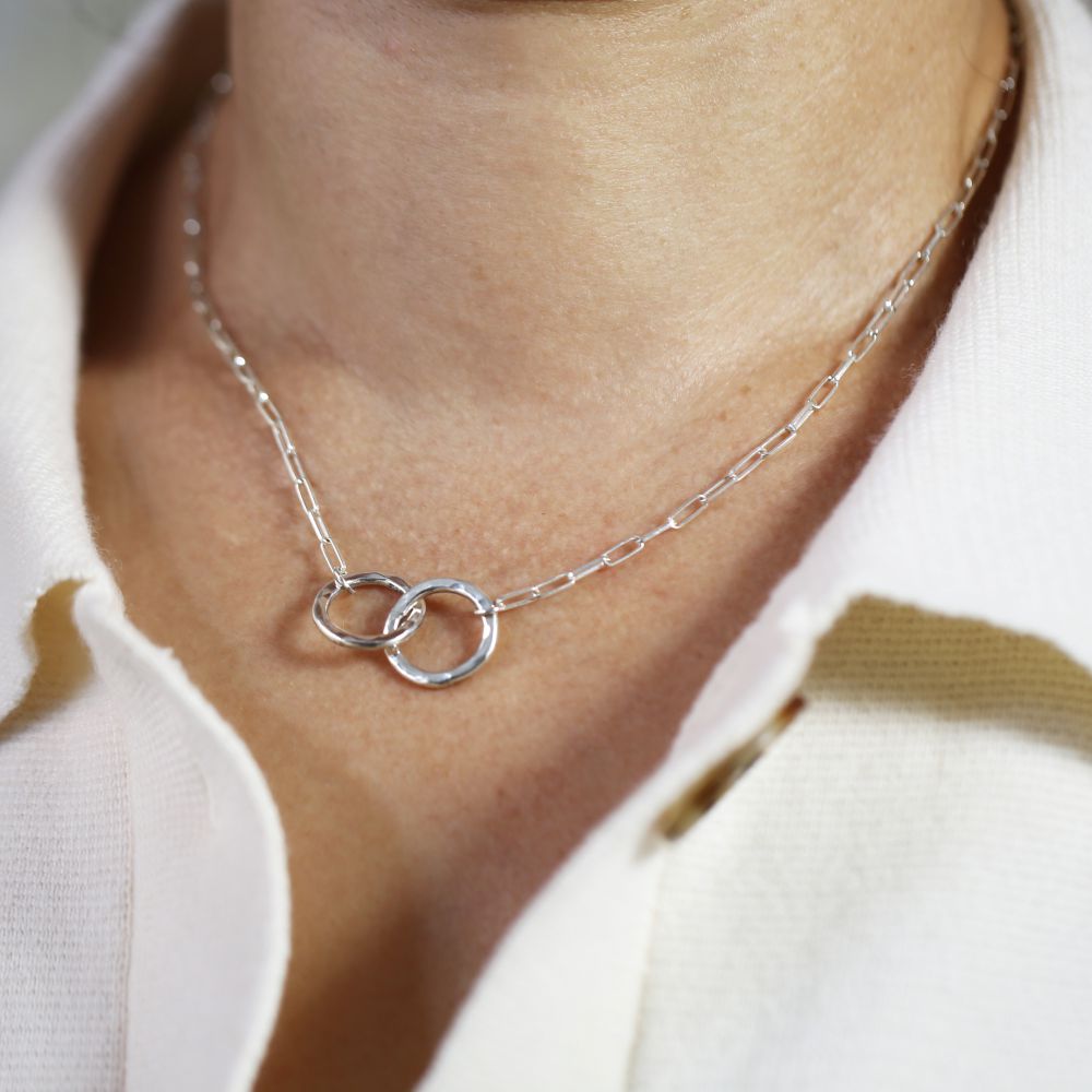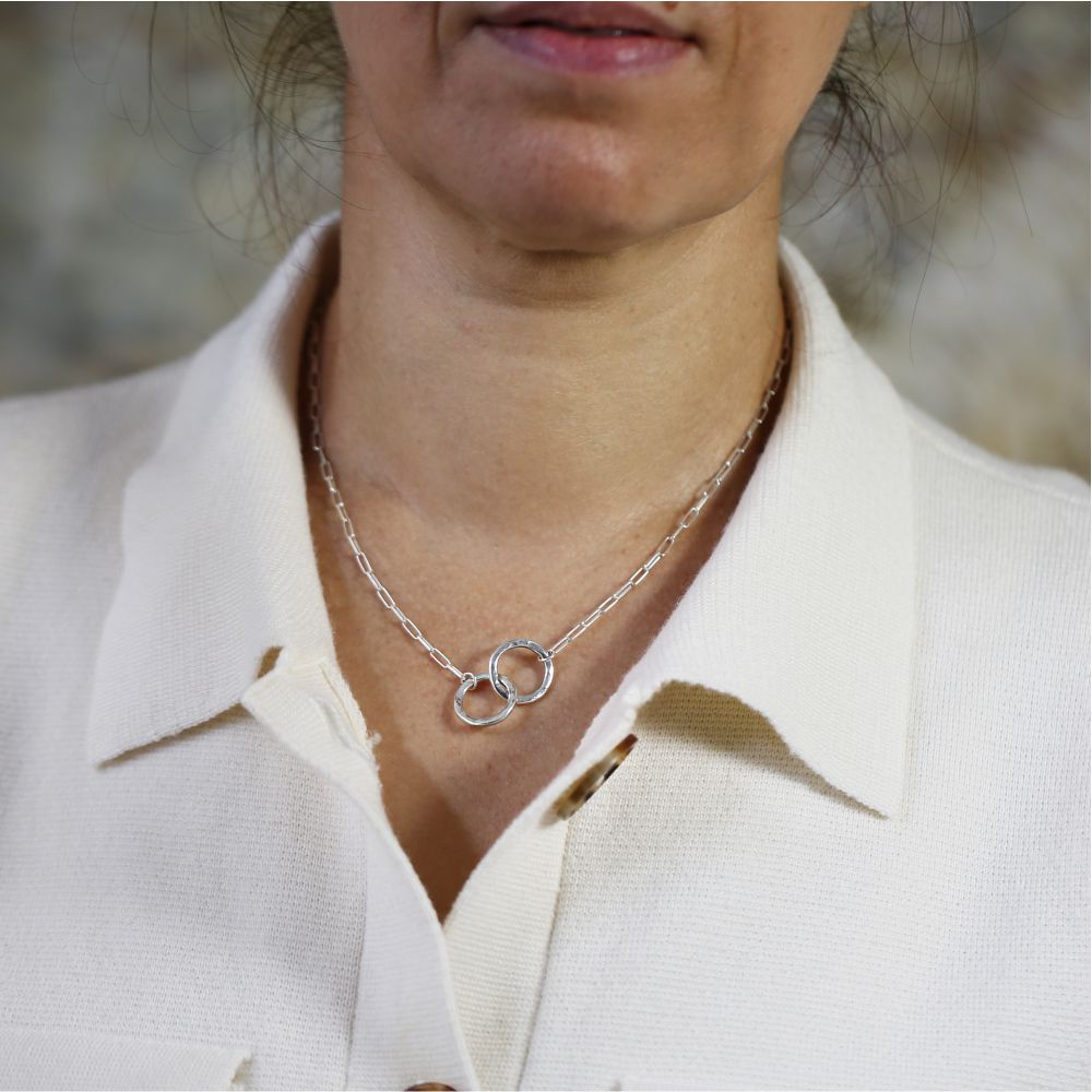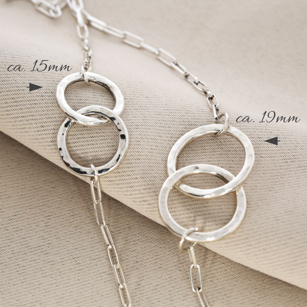 Die Ringe sind abgeflacht und von einer Seite leicht gehämmert und poliert. Auf der anderen Seite kann Gravur platziert werden. Somit ist der Anhänger von einer Seite personalisiert und von der anderen Seite ist es ein schlichter Designanhänger.