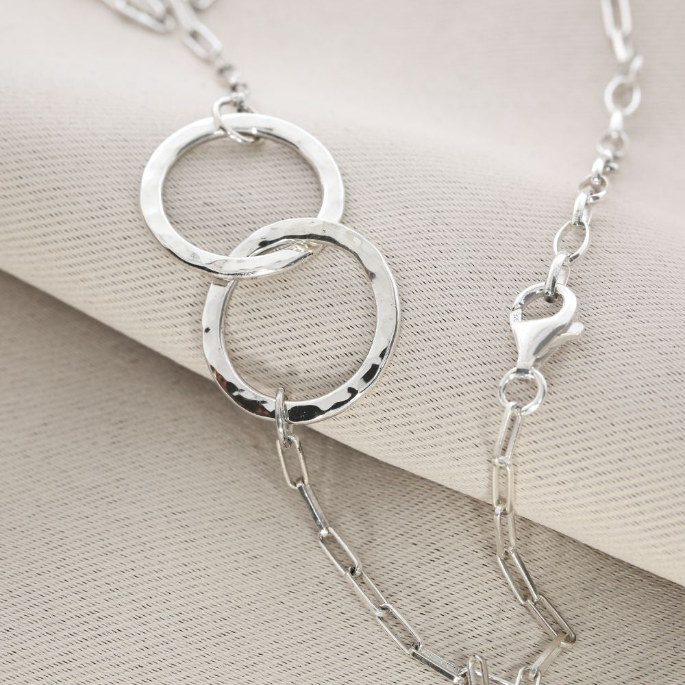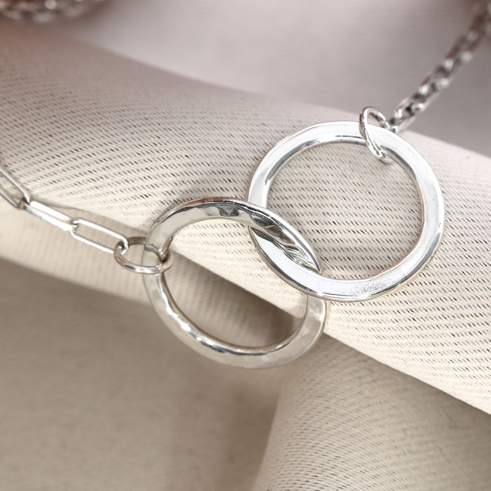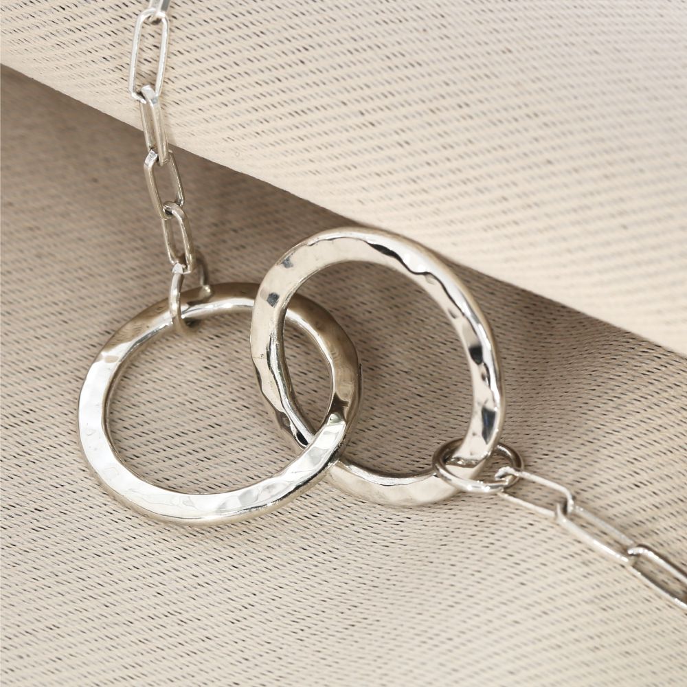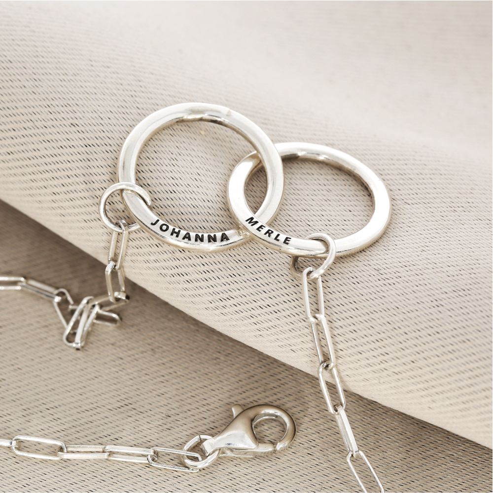Die Ringe sind abgeflacht und von einer Seite leicht gehämmert und poliert. Auf der anderen Seite kann Gravur platziert werden. Somit ist der Anhänger von einer Seite personalisiert und von der anderen Seite ist es ein schlichter Designanhänger.