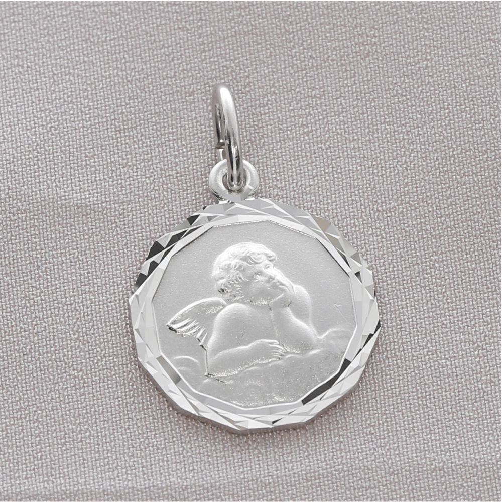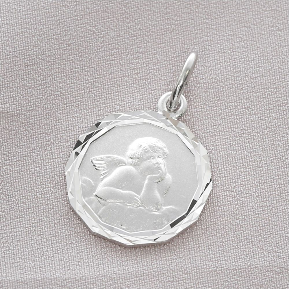 Der Engel ist mattiert, der Rand ist poliert, wodurch ein schöner Kontrast entsteht. Auf der Rückseite kann optional eine Grvaur platziert werden.